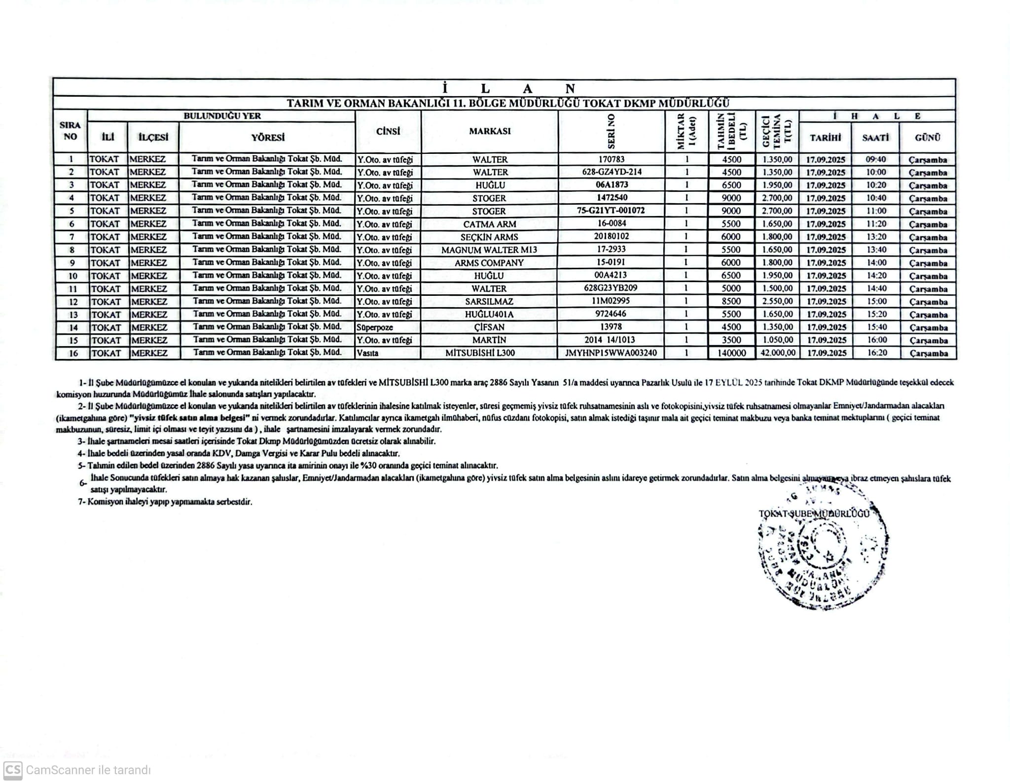 Tokat Doğa Koruma ve Milli Parklar Müdürlüğü'nce yakalanarak mülkiyeti kamuya geçen 15 adet Av Tüfeği ve 1 adet Pick-Up araç; 2886 sayılı Devlet İhale Kanununun 51/a maddesi uyarınca 17.09.2025 günü Tokat DKMP Müdürlüğünde teşekkül edecel komisyon huzurunda ihale ile satılacaktır.