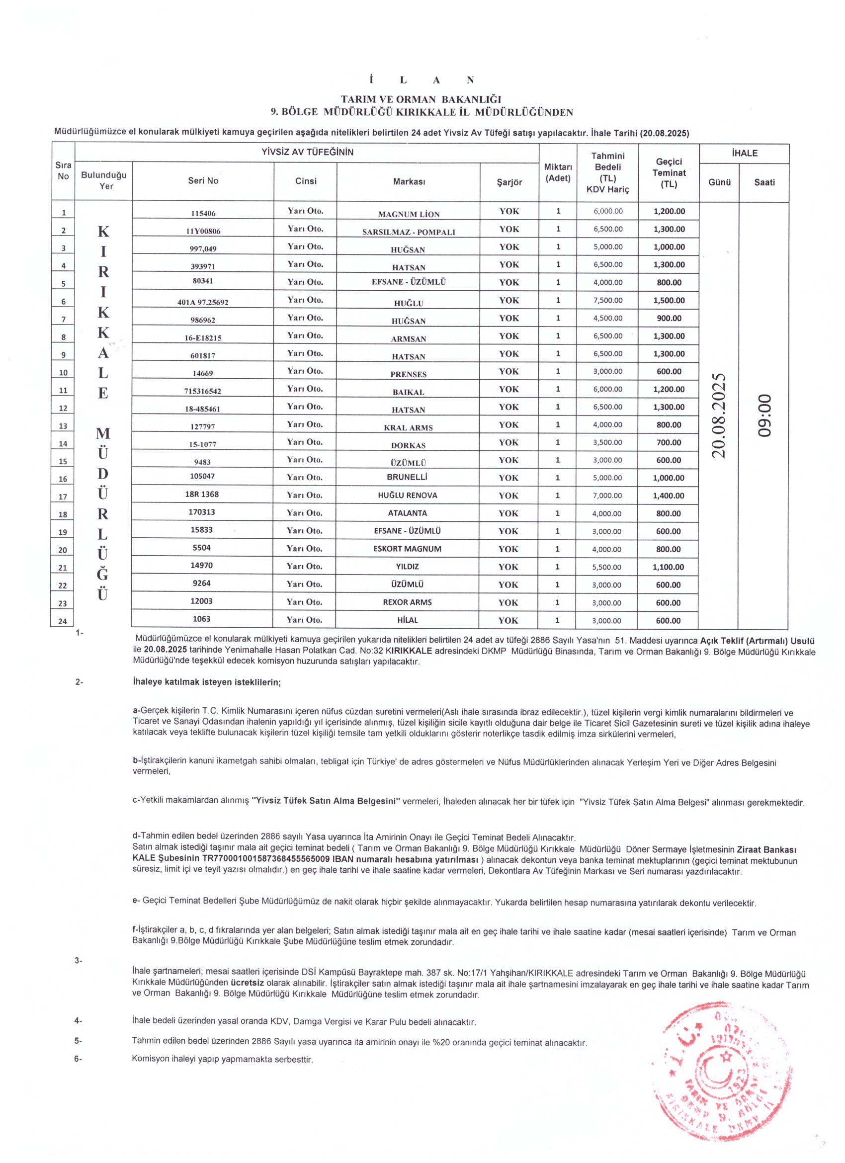 Kırıkkale Doğa Koruma ve Milli Parklar Müdürlüğünce Mülkiyeti Kamuya Geçirilen Av Tüfekleri İhalesinin ilan metni ektedir.